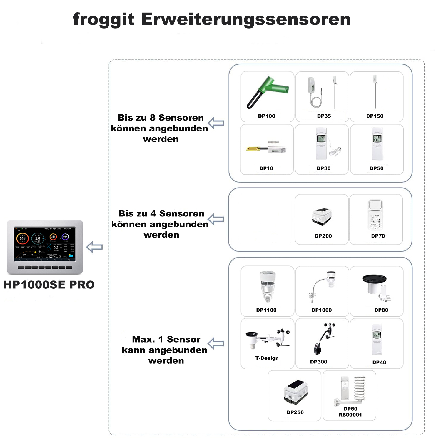 Dank der neuen Firmware V2.0.4 ist die HP1000SE PRO Y-Edition noch vielseitiger. Sie unterstützt bis zu 16 froggit DP100 Bodenfeuchte-Sensoren und zahlreiche weitere Module wie PM2.5 Feinstaubsensoren (DP200), Blitzdetektoren (DP60), Wasserlecksensoren (DP70) oder CO2- und Luftqualitätssensoren (DP250). Damit lässt sich das System individuell anpassen – vom privaten Einsatz im Garten bis hin zur professionellen Umweltüberwachung.